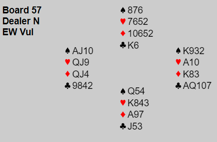 Ved det ene bordet var nord i 3NT etter at øst hadde meldt inn hjerter, men det kom ruter ut og det var kun åtte sikre stikk (5+0+1+2). Kontrakten kan vinnes hvis kløveren tippes.