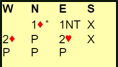 Hvis nord passer i åpning vil øst ved mange bord åpne med 1NT. Da spørs det om syd melder, hvis ikke vil vest overføre til hjerter. Det skjedde der Norge satt Ø/V, og Lars Eide (øst) fikk spille 2 hjerter udoblet. Han slapp unna med to bet etter et ikke alt for skarpt motspill, Finland N/S +100.
