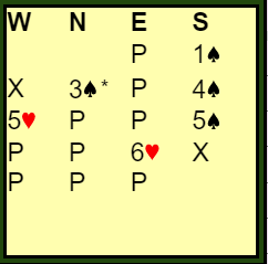 Med ruter ut mot 6 hjerter doblet blir det to trumfstikk til syd. Og hvis syd skifter til kløver i andre stikk etter å ha stjålet utspillet blir det enda en bet med ett stikk i kløver til forsvaret, +500. Kløverskift i andre stikk er logisk siden syd vet at nord har fire spar og vest følgelig er renons.