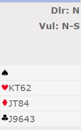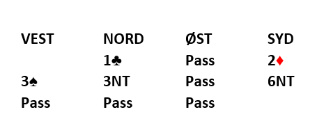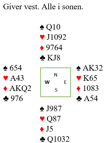 Nord spilte ut spar som neppe kan være riktig? Men han måtte uansett valgt mellom ruter eller kløver, og det blir nok et 50-50 valg i dette spillet som så slik ut: