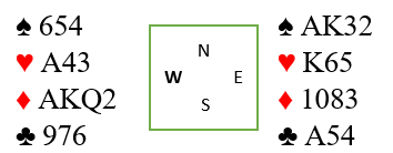Hvis knekten sitter dobbel er det imidlertid litt verre med denne kombinasjonen, for etter A-K i ruter - knekten faller - må det tredje ruterstikket tas med tieren hvoretter øst er fri for fargen.