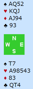Spillet ser veldig ordinært ut. De fleste spillere i den lokale bridgeklubben åpner med 1NT som syd, nord overfører til hjerter før han foreslår 3NT. Syd som da vet om femkorts hjerter tar ut i 4 hjerter siden han har en dobbelton som er stjeleverdi, og sparen kan godt være skummel i grand også.