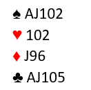 K-J dobbel er ingen ideell kombinasjon, og det samme kan sies om en ugardert dobbelton knekt. Det er dog to-tre plussfaktorer også. Øst har 4-5 fordeling (stikkpotensiale). Han har sparfarge, den høyest rangert fargen. Og kløverfargen er bra, tieren er et godt kort som gir stikkpotensiale.