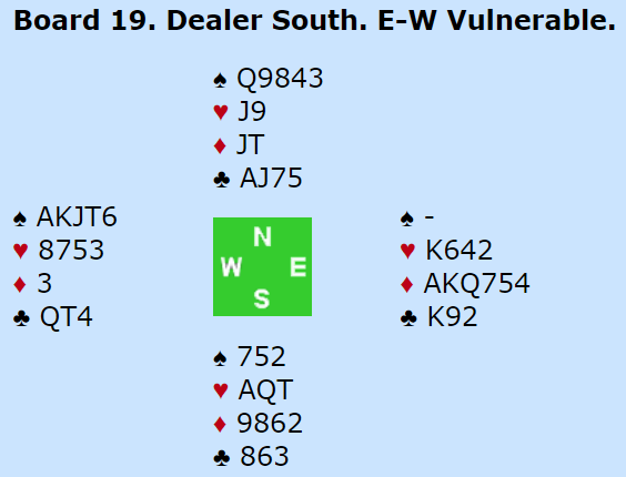 Til slutt satset han på det og ga opp det med en sparstjeling til. Han spilte trumf til esset, stjal en ruter og kunne ta ut nords siste fjerde trumf. Siden spar satt 4-3 stor resten, +1510 for vunnet storeslem!