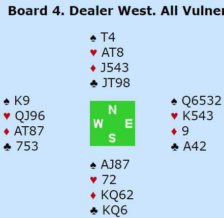 Ved det andre bordet passet Grude med vests kort. Nord åpnet med 2 spar, spar og en minor og under åpning. Bakke (øst) doblet opplysende, og da syd passet gjorde Grude om doblingen til straff ved å passe. N/S hadde 5-3 i spar, men nord tok en sjefsavgjørelse og flyktet til 3 kløver som Grude doblet. Ikke det at det er særlig mye bedre i 2 spar doblet, men...