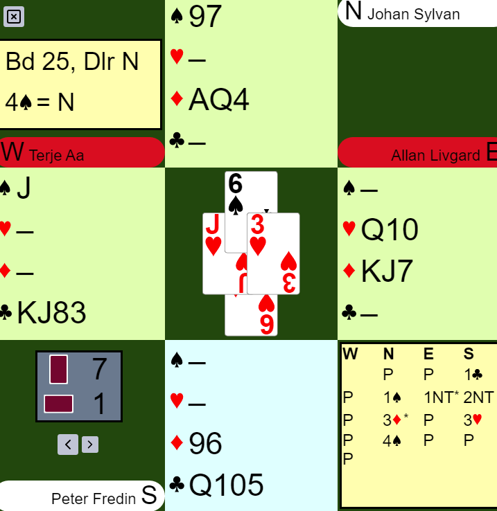 Nord gikk innpå med 3 ruter. Livgård (øst) sa 3 hjerter – pass/korriger (dvs. han har noe tilpasning til begge majorfargene). Nå sa Fredin 3NT.