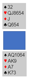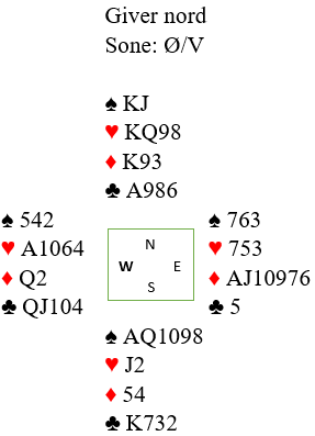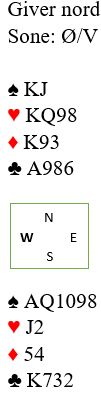 Hvis man er snill, og det bør man jo være, så går det an å se på om det er noen sits hvor lasjeringen er korrekt. Og den finnes, men i så fall har vest funnet et godt motspill. Å satse på at det sitter akkurat sånn er nok som oftest feil, men likevel. Hva om Ø/V sine kort så slik ut fra start: