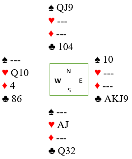 (Merk at nord må holde spar mot slutten og kan heller ikke holde tre kløver etter at ruter 4 og hjerter dame er spilt. Men nord har på dette tidspunktet vist syv spar, to hjerter og to ruter fra start, så han er markert med to kløver)