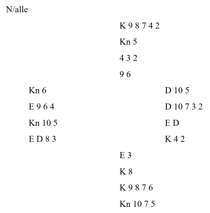 For en gangs skyld var kontrakten lik ved alle bord – nemlig 4 hjerter. Det ble en bet ved ti av bordene, men ved ett hadde Syd gått inn med 2 NT etter 1 hjerter åpning for å vise minor. Utspill kløver knekt til kongen og hjerter ess og liten hjerter brakte Syd inn igjen. Spar ess og spar til kongen, og ruter i vri, men nå hadde Syd sladret så mye i kortene at Øst kunne gå opp med ruter ess og skvise Syd ved å trekke resten av trumfene.