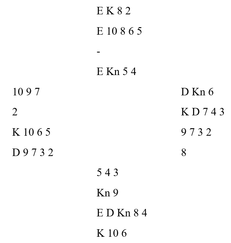 Før spillefører bestemte seg om hvilken vei han skulle spille ruteren tok han fire runder hjerter. Syd fulgte farge alle fire rundene, og dermed var han plassert med ni kort i hjerter og kløver. Nå er det klart størst sjanse for å spille på ruter dame hos nord som trolig har ruterlengden. Ruter ess ble fulgt av ruter til finesse, men kortene stemte ikke med sannsynlighetene i dette tilfellet: