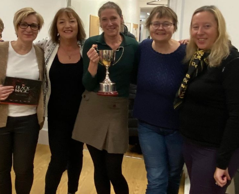Stine, Ann-Mari, Maja og Lisbeth etter seieren i London. (til høyre Paula Leslie fra arrangøren YC Bridge Club)