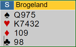 Hjerter ut betyr ingenting egenlig, spillefører kan tillate seg å bomme eller treffe i stikk en (han kan bruke damen, eller håpe utspillet er fra knekten og legge tieren). Han bommet for så vidt da han la tieren og nord dekket med knekten som krevde esset, men etter uttrumfing kastet han en hjerter på ruteren. Om han hadde truffet på hjertervalget ville han fortsatt måtte ha gjettet sparen.
