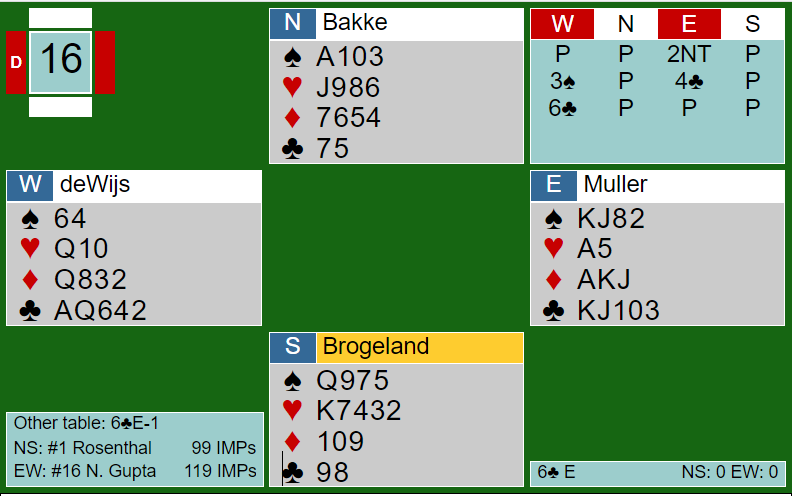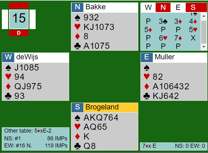 Skummelt spill, for om en ser kun på N/S sine kort er dette en glimrende slem som det norske paret fant. Men slemmen går bet pga. 4-0 sitsen i spar. Både 6 spar og 6 hjerter er glimrende, helt til en oppdager sparsitsen. Å være i slike slemmer som er gode, men går bet pga. sitsen er alltid surt - og skummelt, for det er ingen garanti de er i slem ved det andre bordet. Og som du ser nederst på bildet spilte Boye og Chrstian sine lagkamerater 5 ruter doblet somØ/V med to bet. -300. Hvis Boye og Chrstian hadde fått spille slem og gått bet ville det blitt 9 IMP ut og 42 IMP under før de siste femten spillene. Men for en gang skyld valgte Bauke Muller helt feil da han stampet i 7 ruter.