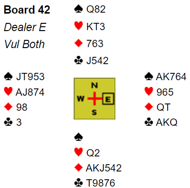 Øst skulle spille 4 spar etter at syd hadde vært innpå med en rutermelding. Syd tok for A-K i ruter og skiftet ved ett av bordene til kløver.