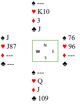 Han andre som vant 4 spar fikk også to runder ruter ut, men der skiftet syd til liten hjerter. Spillefører stakk med esset. Spillet videre gikk på lignende måte og syd ble til slutt innspilt på den single hjerterdamen. Ved det bordet hadde syd sjansen til å kvitte seg med hjerter dame i en av trumfrundene.