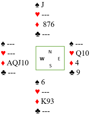 Vest var ferdig, for nå fulgte liten ruter til nieren og vest sin tier. Hun måtte gi syd for ruter konge. Om vest hadde hatt en kløver eller hjerter til ville det ikke hjulpet forsvaret, for kløver/hjerter derfra ville vært til dobbeltrenons som ville gitt stjeling på den ene siden og ruteravkast fra den andre.