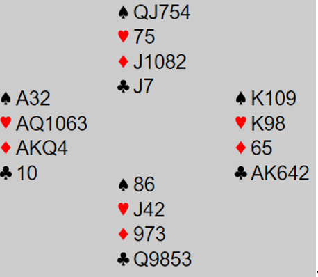 Som Øst åpnet jeg med 1 ruter (4+) og Torfinn avventet med 1 spar med sine 19 hp. Men da jeg kunne støtte med gjenmellding 2 spar (4 kort) ble det bare å bruke 5-ess Blackwood og med svar på 4 NT kom 5 hjerter. Da tok Grylle affære og slo til med 7 spar. Hjertrr ut men med trumfen 3-2 var det 5 stikk i trumf (to stjelinger>), 5 i kløver uten 5-1 eller verre imot og 4 stikk i rødt. Men bare middels pluss siden mange fant storeslem i major. 7 NT er dødfødt, altså lurt å begrense seg litt også.