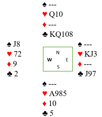 Etter at begge spilleførerne spilte seg over til syd på kløver ess for å ta ut den siste trumfen så det slik ut (men i dette diagrammet har kløver knekt byttet plass med kløver 3):