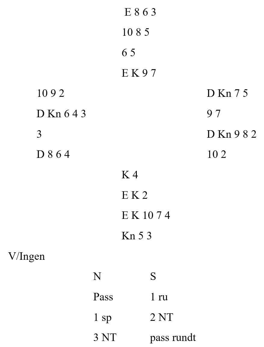 Liten hjerter ut til åtte, ni og dukk og mer hjerter til esset. Liten ruter til åtteren og ruter dame i vri som jeg skulle kaste et kort på. Det ble spar ti, noe som skulle vise seg å bli skjebnesvangert senere i spillet. Det kom liten kløver til nieren og tieren og mer kløver til knekt, dame og konge. Spar til kongen, kløver til syveren. På kløver ess og hjerter til kongen ble makker ubønnhørlig skvist i spar og ruter. Hvis jeg bare holder mine tre spar, blir det ingen skvis og bare ni stikk. Kastet kostet bare ca 10 poeng viste det seg, men jeg skal jo bare la hjerterne mine gå.