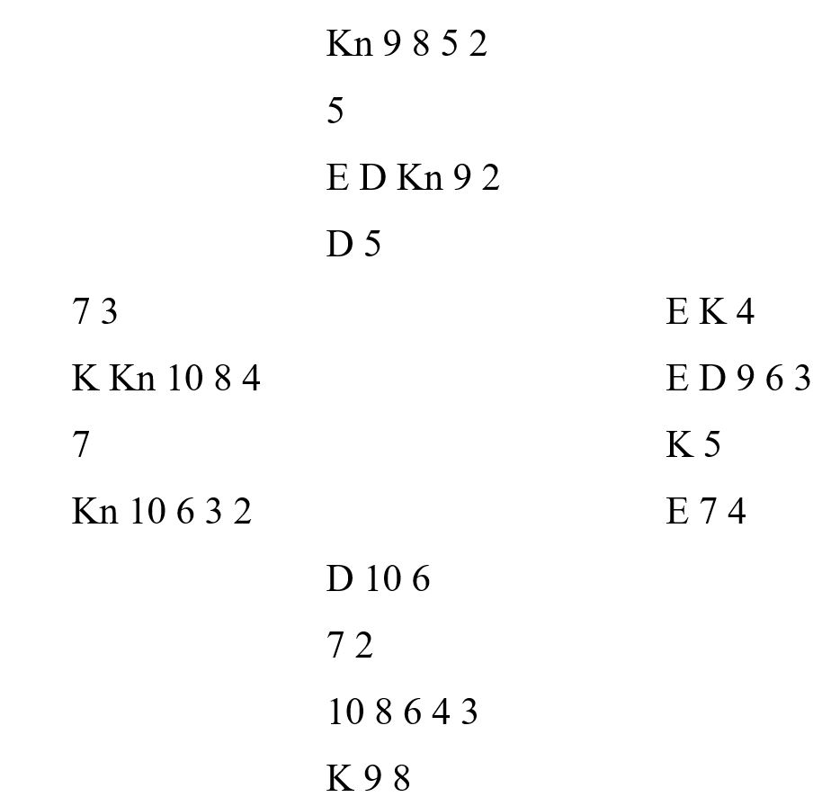 Kontrakten var 4 hjerter hos Vest etter at Nord hadde åpnet med 2 spar som viste en 2-fargehånd. Spar ut til esset, to ganger hjerter og ruter mot bordet. Nord tok for esset og fortsatte fargen. Spar ess og spar til stjeling, og nå er oppgaven å unngå to kløvertapere. Det beste må være å spille kløver ess og mer kløver. Denne gangen kommer Nord inn og må spille til dobbelrenons. Det funger også hvis Nord skulle ha singel kløverhonnør.