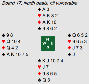 Han stakk med ruter ess, tok for hjerter ess-konge (vest la damen som falsecarding), så kløver. Øst kastet en ruter og syd stjal . Så ruter til kongen og nok en kløver. Øst kunne ikke gjøre noe fra eller til og kastet en hjerter. Deretter fridde spillefører seg med en ruter til vests dame, og disse kortene var igjen: