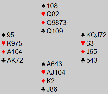 Begge lags Ø/V-par (Evenstad/Heiberg-Evenstad og Brogeland-Gillis) meldte en vakker 6 kløver med disse kortene: