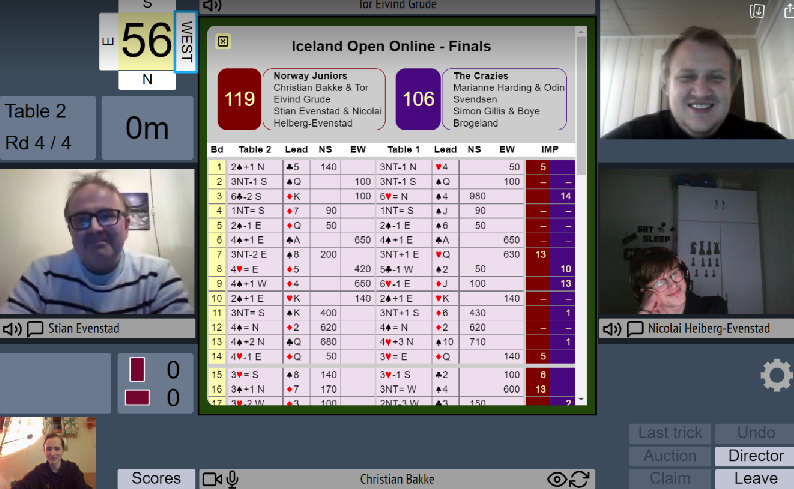 I 5-6 spill var marginen slik at ett enkelt spill kunne snu det hele, for Norway Juniors ledet kun med et ensifret antall IMP. Så vant Stian Evenstad en utgang som gikk bet ved det andre bordet da det kom et annet utspill, 12 IMP. Ledelsen var da på rundt 20 IMP.