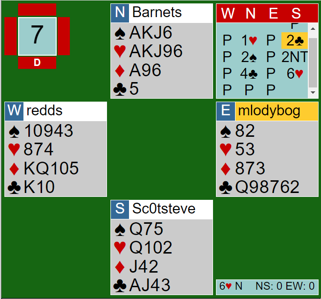 For idet han stjal kløver for andre gang kunne vest kastet spar og spolert det fine spillet som nå kom, men antagelig burde ha skjedd allerede. Det er ikke så lett for vest å kaste spar, for husk nord har vist fire spar i meldingene. Vest kastet ruter som ser naturlig ut å gjøre, og siden kløverstjelingene ikke førte til noe ekstra for spillefører gikk Shenkin over på den planen som måtte til for å vinne 6 hjerter.
