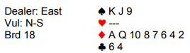 Jeg tar med et spill med voldsom fordeling og mange stikk begge retninger. Dette er et slikt spill hvor det er fryktelig vanskelig å vite hvem som har høyeste kontrakt, hvem som egenltig stamper.