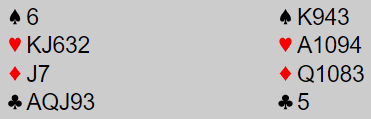 Men spill 14 i SBK torsdag var kanskje vel så artig, Det var med Øst giver og vi som satt imot med ingen i faresonen. Knut Molander åpnet med 2 hjerter, sammen med Atle Evensen i øts for anledningen. Se på min hånd i Syd, gigantisk fordeling og bra honørstyrke, ikke sant?