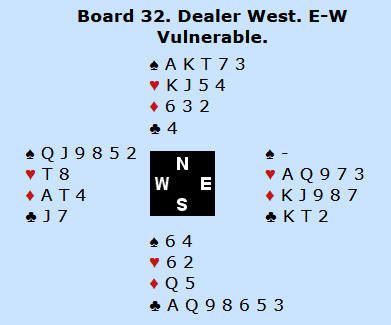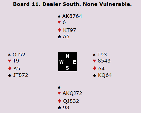 Norge fikk inn en slemsving på dette spillet i kampen mot Sør-Afrika da Christian Bakke og Boye Brogeland meldte 6 ruter, mens det motstanderne ved det andre bordet havnet i 5 grand etter en meldemisforståelse.