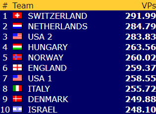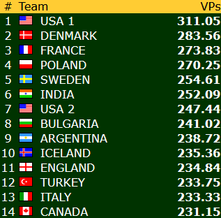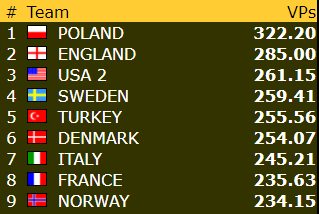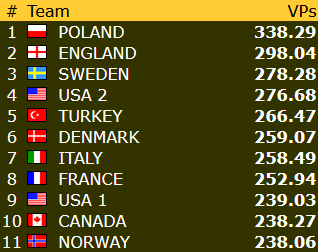 * På grunn av en summeringsfeil i regnskapet har Norge fått med seg for lite vinnerpoeng fra kampen mot Brasil, og har i realiteten nesten 3 VP mer. Riktig totaltscore for Norge etter 22 av 23 runder er 240,98 VP.