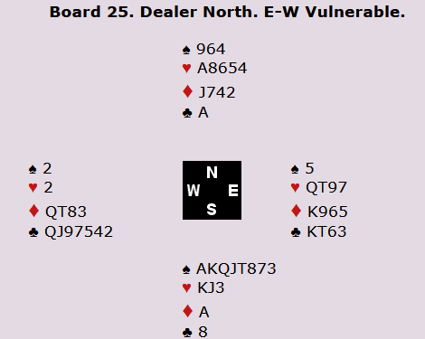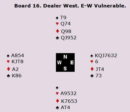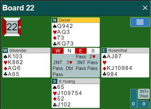 Silverstein gikk i gang med ruteren. Nord fikk betydelige sakeproblemer. Mot slutten holdt nord tre spar og to kløver. Silverstein tok for kløver ess og spilte kløver til nord som måtte spille spar til saks. Tolv stikk, tre doblede overstikk og den sjeldne scoren +1350!