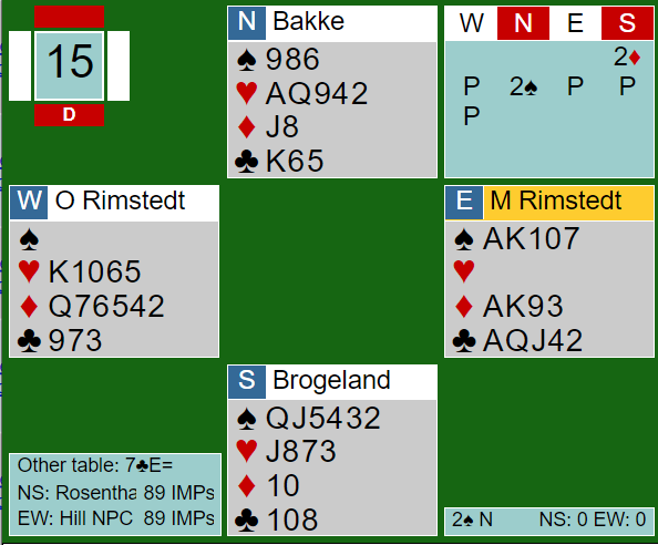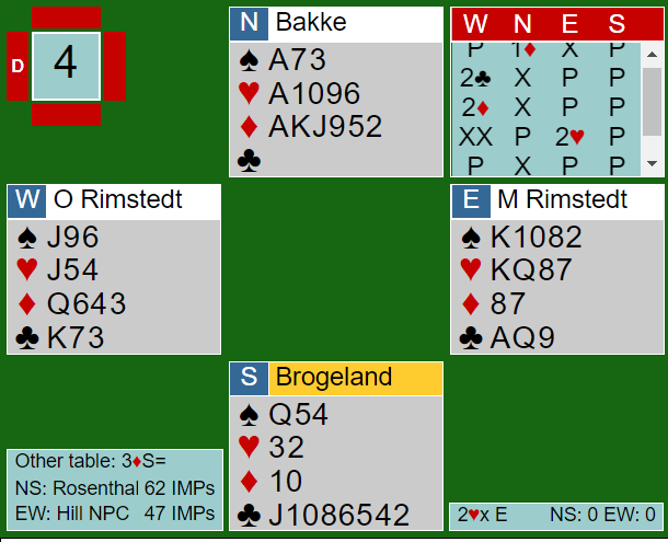 Her var det ingen nåde fra det norske paret. Bakke la opp en rekke rødlapper og Brogeland stod med på 2 hjerter doblet. Idet røyken hadde lagt seg var det tre doblede bet i faresonen, +800. Med en delkontrakt i ruter N/S hvor det ble ni stikk ved det andre bordet var spillet verd 12 IMP. Det beynte å se lyst ut for ROSENTHAL.