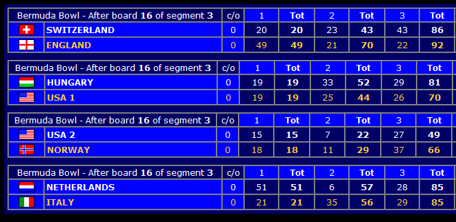 Her er resultatene etter halvspilte kvartfinaler i Bermuda Bowl (åpen klasse):