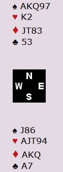 Om syd skal ta vekk bordets siste trumf, går det på bekostning av trumfstikket. Dermed må øst enten få seks trumfstikk på hånda og ei stjeling i bordet, eller eventuelt syv trumfstikk på hånda. Resultatet blir uansett syv stikk og fem beit for scoren 1100 ut. Det tilsvarer 7 IMP i den norske kolonnen når man sammenlikner med 1390 fra det andre bordet.