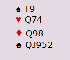 La oss si du sier 2 spar - Michaels Cuebid - minst 5-5 i hjerter og en minor. Vest passer og nord sier 3 hjerter. Det er kun preferanse, og han behøver ikke ha særlig mye. Hva gjør du nå?