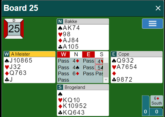 6 kløver bød ikke problemer siden kontrakten kom på vest sin hånd. Om øst er spillefører blir det ganske automatisk bet om syd spiller ut hjerter. Vest sin 1 kløver var sterk, kunstig melding. Morten Bilde sin 2 hjerter var et svakt innhopp. Og her hadde Ø/V en god avtale, 2NT viste kløverfarge. Vests løft til 6 kløver over 5 kløver var vel litt frisk, men blink.