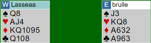 Hvis øst åpner med 1 ruter har vest til omvendt minor (2 ruter som krav). Etter det er det for mange stoppervisning for å finne ut om 3NT er bra, men med slike kort som øst har bør han si 2NT etter min mening, selv med knekten dobbel i spar. Da blir det 3NT ut av det. Om de starter med 1 ruter-2 ruter og tenker for mye (er litt for "clever") kan de rote seg i 5 ruter. Men som du ser står ikke verken 3NT eller 5 ruter denne gangen om da ikke det er en av miraklesitsene i kløver, og det gjettes på hvilken. At det ikke står i 3NT er i teorien. I praksis står mye oftere 3NT enn 5 ruter! For eksempel er det ikke sikkert han som skal spille ut har et opplagt sparutspill.