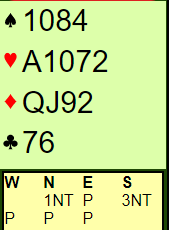 Vi tar med et spill fra 6.runde, hvor Studentenes BK 3 gikk videre, og hvor Tor Eivind Grude fant en småfrekk spilleføring. Først var det et utspillsproblem hvor øst bommet, men kontrakten 3NT var egentlig sjanseløs likevel.