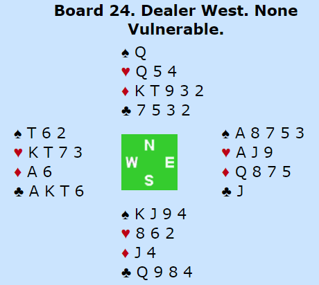 I lukket rom servet øst sp 3 til 9er og ess. Så kom samme hjerterbehandlingen men inne på hj K fortsatte van den Bos med kl J og Nord kom inn. Betheau prøvde deretter å godspille ruterfargen, men Van Lankveld sine signaler gjorde det lett for Øst å lasjere. Dermed fikk Nord også taperne sine i spar og gikk bet. I kampen lykkes Nederlenderne omtrent med alt og vant 68-3. De er nok favoritt til å vinne mesterskapet?