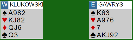 Det må ha vært innmeldingen med få honnørpoeng som fikk Klukowski til å spille på en veldig fresk trumfvariant basert i at han trodde nord hadde god fordeling. Han stjal den andre ruteren før han spilte hjerter ess - begge fulgte med småkort - fulgt av hjerter 9 som fikk seile! Og det var en innerblink: