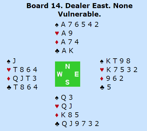 Tre ganger hjerter før trumf ble spilt gikk bra for spillefører, bort med kløvertaperen hos vest, og så trumf. Dermed ble det en voldsom +980 til notering for Serbia. Ved det andre bordet var også Sveriges Ø/V-par i 6 spar, men der kom kløver ut og det ble en bet. Spillet ga 14 IMP til Serbia som vant kampen med hele 71-17.