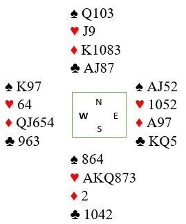 Da vest var inne på spar konge spilte hun ruter dame som ble dekket med kongen og esset- Øst var inne, og spar Q-10 var gardert. En spar forsvant på nords fjerde kløver, åtte stikk og +110.