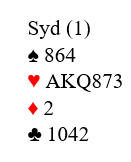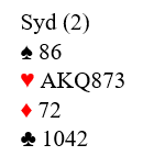 For syds hopp til 2 hjerter var som sagt svakt, og dermed kan ikke syd ha flere honnører, for han er plassert med A-K-Q-sjette i hjerter, 9 poeng. Han kan vel kanskje ha spar knekt i tillegg, det gir i så fall 10 poeng.
