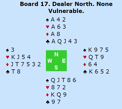 Marthinussen i Øst åpnet med 1 hjerter (5+) og jeg svarte 1 spar. Gjenmelding med hopp er minst utgangsinvitt og krav mot styrke 8-9 men Arne nøyde seg med gjenmelding 2 ruter Det var da med 7- kort bra farge naturlig å gjenmelde 2 spar. Arne gjenmeldte 3 hjerter, jeg 3 spar som Marthinussen løftet til 4 spar. Nord ga meg fordel ved å spille ut kl A og fortsette med kl D som gikk til min konge. Hvordan unngå 4 tapere? Jeg mangler jo trumf dame blant 5 spar de andre har samt taper i både ruter og kløver i tillegg. Det er 6 hjertere ute og sitter den fargen 3-3 imot kan jeg kanskje få sak nok i minor, men med 5 trumf ute med damen på topp kan jo majesteten sitte dobbel? Jeg valgte siste mulighet, spilte trumf til esset og ruter derfra som løp til demen i Nord. Kløver opp til Syd sin knekt ga -1 da Nord opprinnelig satt med sp D93 og damen måtte gi dem det 4. stikket. Men her var kortblindhet og dårlig valg ute og gå. Nord hadde sp D93- hj 1986- ru D1074- kl AD9 og hadde jeg etter 3. stikk der sp A vant spilt hjerter fra topp, på 3. honør saket ru J og så spilt hj 10. Da må Syd som bare har sp 5 igjen stjele, men da saker jeg bare kl 7- klassisk «taper på taper» og med tett trumf ellers ender det bare med en taper til uansett hvordan trumfen skulle sitte. Men vi tålte -2 siden kvelden ellers bød på mange plusspill.