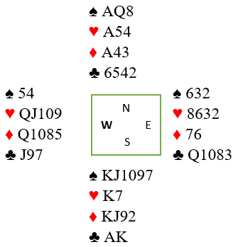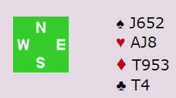 Dette er en helt vanlig 3NT selv uten hjerterstopper, for med 3-3 i hjerter hos N/S avhenger 3NT normalt kun av at hjerteren ikke sitter 5-2 hos motparten. Den satt 4-3, men som du ser satt både ruter og kløver uheldig, og det er bare åtte stikk med kun tre i de to fargene.