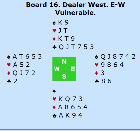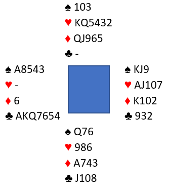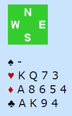 Budet 5 hjerter spurte om makker hadde spar dame men (feilaktig) benektet 5 spar den majesteten. Derfor risskerte jeg bare å melde lilleslem. Spillet var enkelt, kl K ut til esset, så sp K men da Nord var renons ved et taper i trumf! Hell i uhellet altså. Det var mulig å få 12 stikk men ikke mer i sparkontrakt. Men mange spilte grand- kontrakt, 4 par var i 7 NT som normalt bare er å legge ned, men ikke alltid med sparen J10xx mot renons. Mit 6-7 NT av Øst spilte de fleste ut kl 4.til damen i Nord og ditt ess. Kan du vinne 13 stikk?