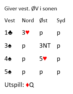 Jeg synes innmeldingen 2 kløver er helt grei utenfor sonen (gunstig), men nord for Latvia passet over Nicolai Heiberg-Evenstads 1 spar. Markus Lund (øst) meldte 4 spar, og syd doblet. Da gikk det pass rundt. Der ble det to bet, Norge -500.