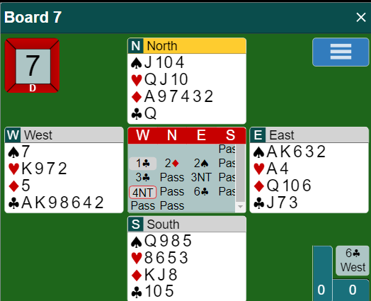Berg tenkte slik: Jeg vet pga. meldingene at vest har minst fem spar og minst seks kløver. Og han er renons i hjerter, nord må jo ha sekskorts farge. Så enten har vest 5-0-2-6, eller 5-0-1-7 og nord har følgelig 2-6-4-1, eller 2-6-5-0 fordeling. Siden vest hadde litt lyst til å melde slem, uten ruter ess og uten trumf dame må han nesten ha singel ruter. Og da er makker renons i kløver!